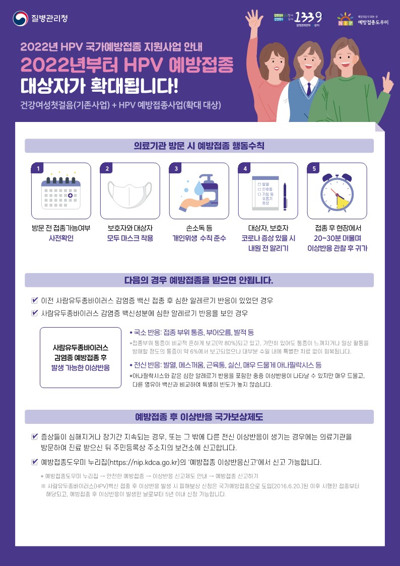 질병관리청에서 2022년 HPV(사람유두종바이러스) 국가예방접종 지원 대상자를 확대하여 - 만 12~17세(2004.1.1.~2010.12.31.출생자) 여성 청소년 및 - 만 18~26세(1995.1.1.~2003.12.31.출생자) 저소득층 여성 대상으로 HPV 백신 접종을 전액 무료로 국가 지원하고 있으니 많은 관심 부탁드립니다.