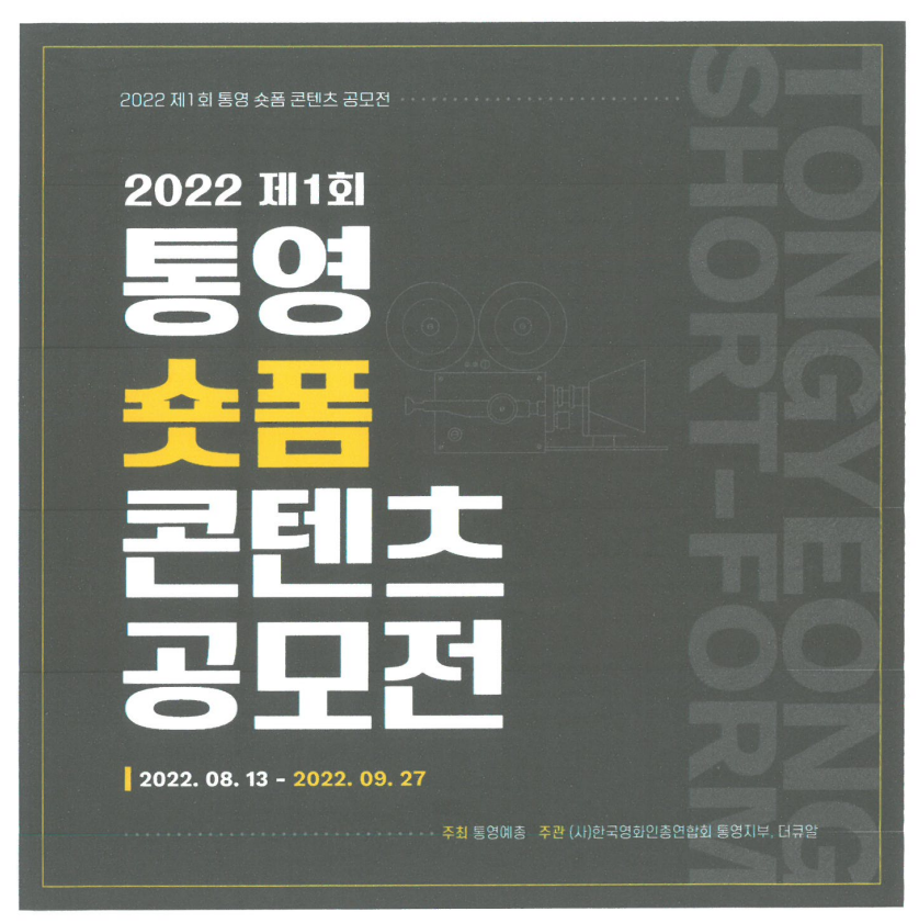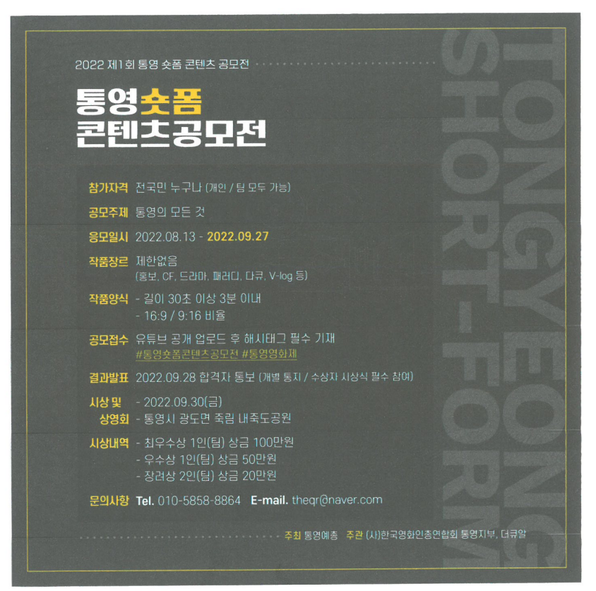 제61회 통영 예술제에서 제1회 통영 숏폼 콘텐츠 공모전을 개최하오니 많은 참여와 관심 부탁드립니다.